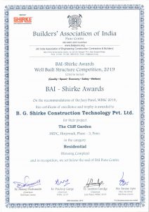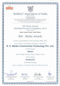 Builder’s Association of India, Pune Centre, presented the Shirke Group with “Well Built Structure” awards for year 2019 in two categories. The MHADA Project for Affordable Housing at Pimpri Waghere, Pune and Residential Housing Complex at Hinjewadi Pune for TCG Real Estate