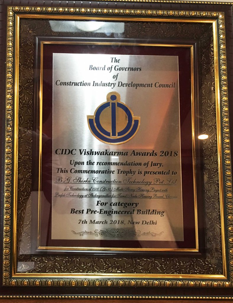 CIDC -2018 Award for Construction Multi-storied Housing Project Posted by shirkegroup on March 20, 2018 Best Pre-Engineered Building CIDC Vishwakarma Awards 2018, in the category ” Best Pre-Engineered Building” for Construction of 1500 (G+10) Multi Storey Housing Project with Prefab Technology at Sholinganallur for Tamilnadu Housing Board, Chennai.