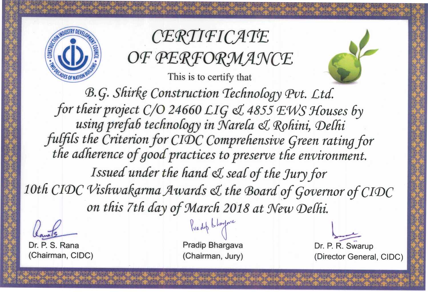 CIDC Vishwakarma Awards 2018, Certificate of Performance for fulfilling the criterion for CIDC Comprehensive Green Rating for adherence of best Practices to preserve the environment ” for Construction of 24660 LIG & 4855 EWS Housing by using Prefab Technology in Narela & Rohini, New Delhi