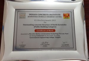 Indian Concrete Institute, Hubballi-Dharwad Centre, presented the B G Shirke Construction Technology Pvt. Ltd with the “Outstanding Concrete Structure of North Karnataka” award for year 2019 for the project Government Engineering College at Talkal, Koppal District..